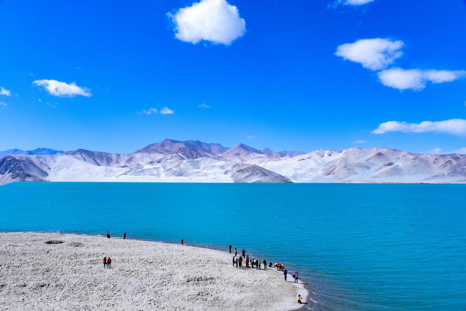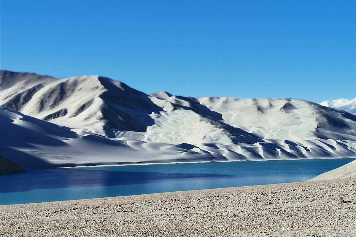 白沙山山体表面附着的白沙经过了数万年风化,在帕米尔高原洁静的阳光下,闪耀着金属般的光泽。湖水在天空、白沙和雪山的综合作用下呈现出一种别样的蓝,深邃的蓝,非常迷人。