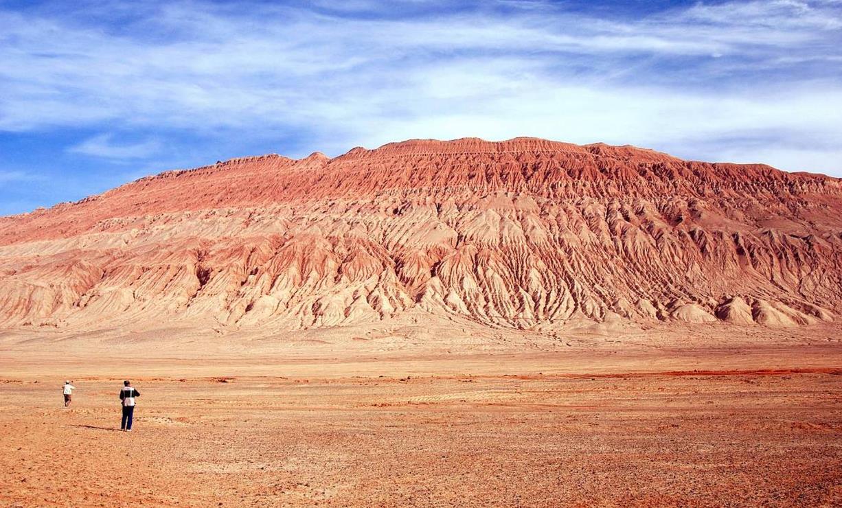 火焰山位于吐鲁番盆地中部,当地人称“克孜勒塔格”,意即“红山”。由吐鲁番向东去鄯善的路段中,有百多公里蜿蜓起伏的红色山峰。这是一条东西长约100千米,南北宽7 ~10千米,平均高度500米左右的年轻褶皱低山。最高峰位于胜金口附近,海拔851米。它主要由中生代的侏罗纪、白垩纪和第三纪的赤红色砂、砾岩和泥岩组成。山体雄浑曲折,主要受古代水流的冲刷,山坡上布满道道冲沟。山上寸草不生,基岩裸露,且常受风化沙层覆盖。盛夏,在灼热阳光照射下,红色山岩热浪滚滚,绛红色烟云蒸腾缭绕,热气流不断上升,红色砂岩熠熠发光,恰似团团烈焰在燃烧,故名火焰山。这里是我国最炎热的区域,夏季气温高达摄氏四十七度,据说山顶气温可达摄氏八十度。