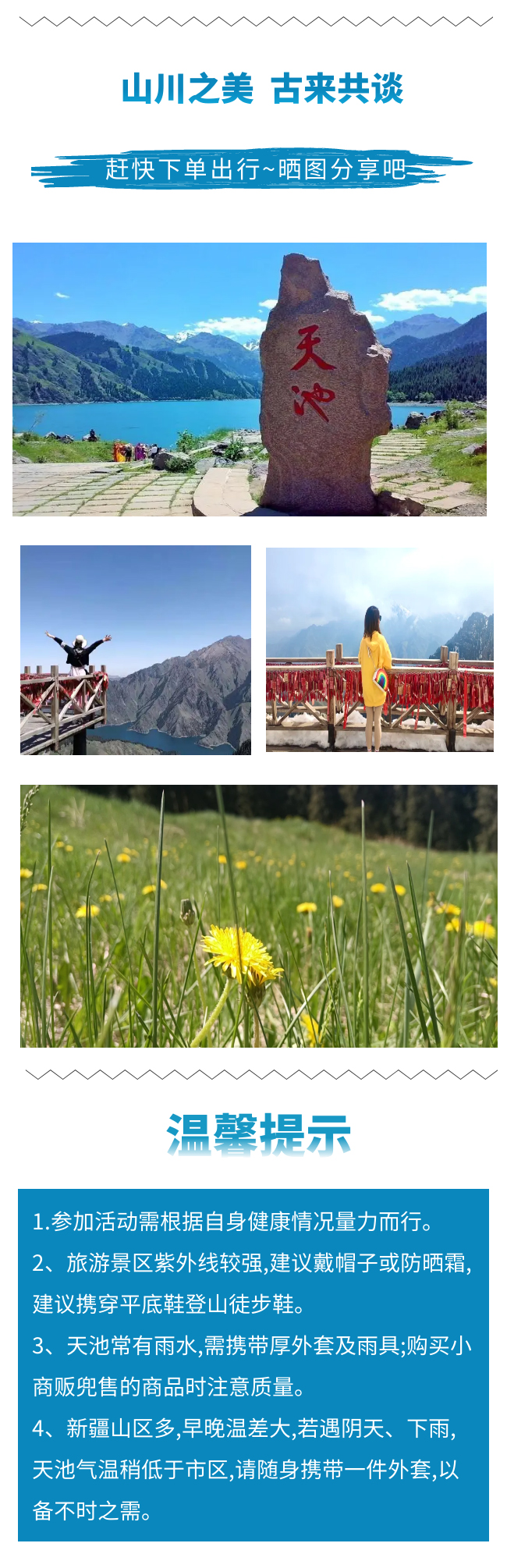 温馨提示: 1、天池景区紫外线较强,请您记得戴好帽子或涂防晒霜做好自身防晒工作,建议穿着舒适的平底鞋。 2、马牙山索道、双湖游船、西王母庙等,均属于景区内自费项目,您可以根据自己的意愿自行选择,我社不强推自费。 3、客服24小时可接听电话,如超过夜间24:00可电话咨询当天是否有空位。