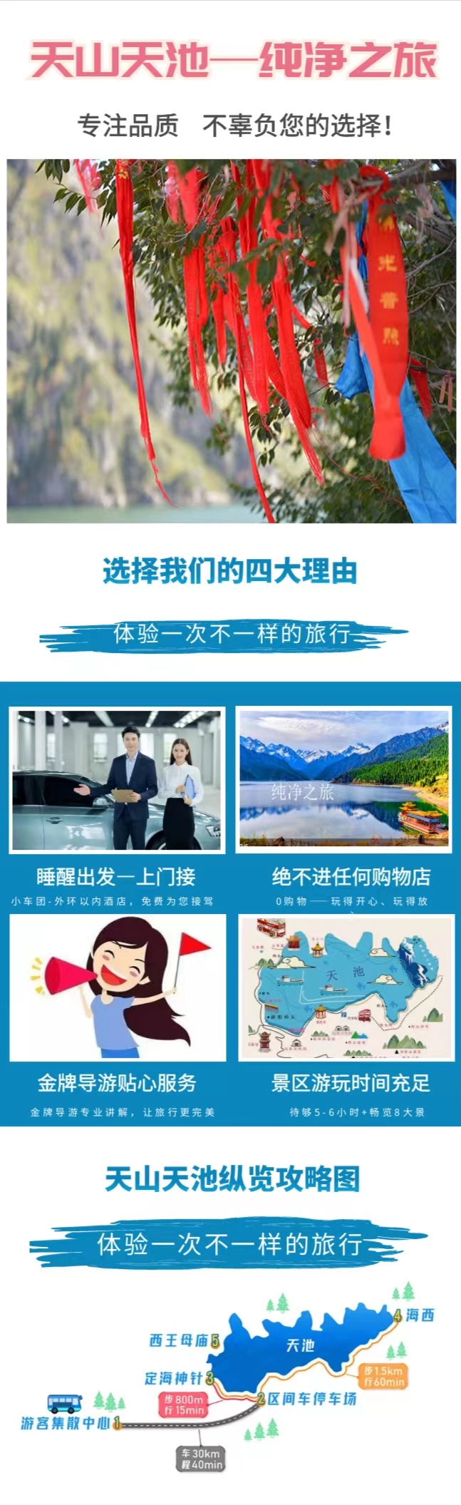 景区娱乐项目自愿选择参加:哈萨克家访100元/人 马牙山索道220元/人 天池游船100元/人(仅供参考,具体以景区标价为准)