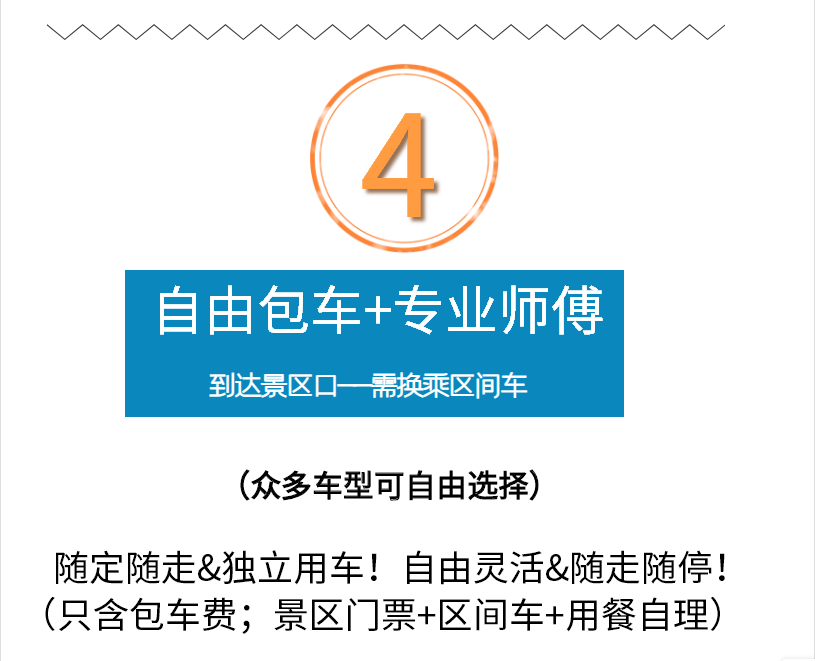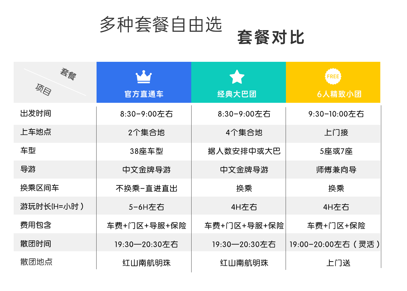 请您按约定时间提前抵达集合地点等候上车。(具体集合时间及地点由出行前一天晚上我社发车部短信通知为准) 套餐区别: 【经典大巴团】 08:00 左右南航明珠 08:15 左右环球酒店 8:30左右铁路局iu酒店 8:45左右卡子湾车管所 市区多个沿路上车集合地点,可选择就近上车(具体集合时间及地点由出行前一天晚上与我社工作人员沟通为主) 费用包含:往返大巴车费+门票+区间车+10人以上派导游(需到集合点上车) 2-6人小车团:睡醒出发,上门接+送(具体出行时间,以前一晚师傅联系沟通为准)。 费用包含:往返车费+门票+区间车