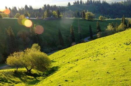 【那拉提空中草原】这一片悬挂在天际的草原,仿佛故意不让人一眼看透,因此并不一望无际, 而是如大海般掀起碧波巨浪,让人在高低起伏中看到不同的美,而其中一排排绿树则如一面面屏风, 将这片草原分割成小块,让人不得不缓步慢行,细细品味。