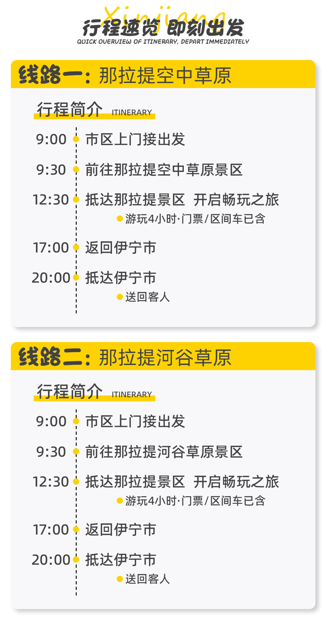1、约定时间在约定地点等待司机上门,快到附近司机师傅会联系。同车不同游客,司机抵达时间会有 间隔,可以在约定上车点稍作等待。 2、接送范围:重庆路以东,北环西路以南,胜利北路以西,新华西路以北范围内;以及伊宁火车站, 伊宁机场、中亚国际、天缘国际、恒润国际顺路酒店,仅限酒店不包括巷道内民宿客栈,接送不进小 区内,超出接送范围联系客服,超出范围产生费用客人自理。 3、旅游旺季景区会有不同程度的排队或者堵车情况,行程时间会有变化,旺季结束时间一般在 22 点 左右。
