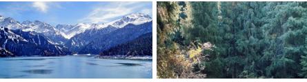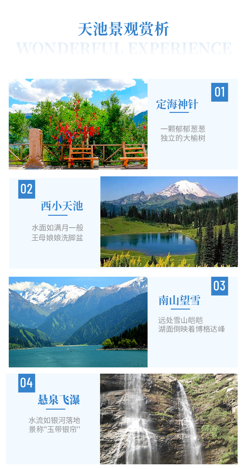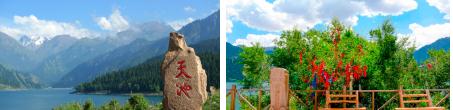 ⭕️抵达天山天池湖边, 远处的博格达峰倒映在碧绿的湖水中,游览天山天池八景中的【定海神针】🌲【南山望雪】🌲【西山观松】🌲了解王母娘娘在天池湖畔宴请周穆王的美丽传说。