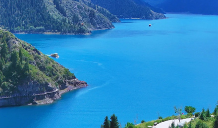 🚩区间车抵达天池湖边,远处的博格达峰倒映在碧绿的湖水中,静谧壮观。博格达蒙古语意为“众山这神”,海拔达5445米。远望雪山人们会心旷神怡舒畅豁达。(远观)