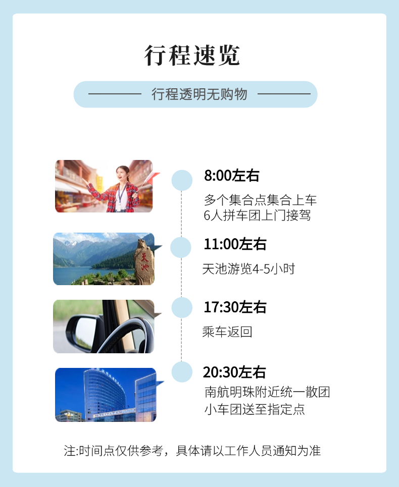 🚩经典大巴团集合点: ⏰ 8:00红山南航明珠酒店门口 ⏰8:10八楼昆仑宾馆 ⏰8:15北京路环球大酒店 ⏰8:20 北京路第九中学门口 ⏰ 8:30北京路铁路西单商场对面IU酒店 ⏰8:40卡子湾管理处52路公交车站终点站河滩辅道入口处集合上车 📢有多个集合点上车,您可地图搜索距离最近的集合点。 🌈具体出行时间地点请以工作人员通知为准。行程时间安排仅供参考; 💕 费用包含:【此行程包含】 成人:天山天池门票+区间车费用+往返大巴座位费+优秀导游讲解服务费 儿童:只含往返大巴座位费(6周岁以内,1.3米以下)