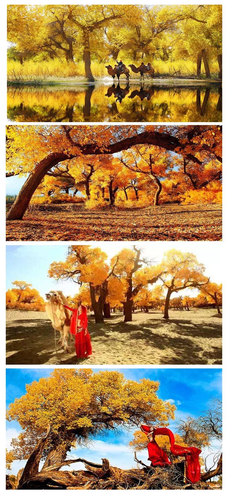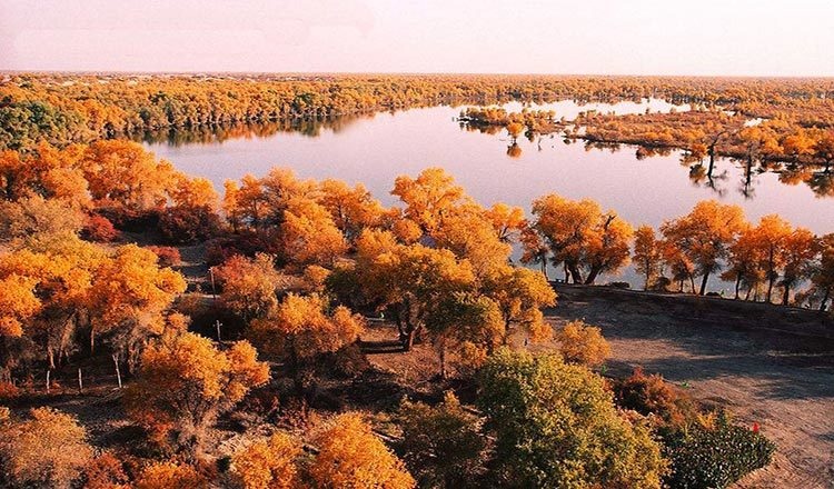 塔里木胡杨林这片胡杨林是新疆原始胡杨林,也是我国的一片生长在沙漠里的胡杨林。死而不倒一千年,倒而不朽一千年。就是说就算是树死了,但是树魂只剩皮还依然挺立。十月份的时候树叶全部都黄了,金灿灿的特别好看。