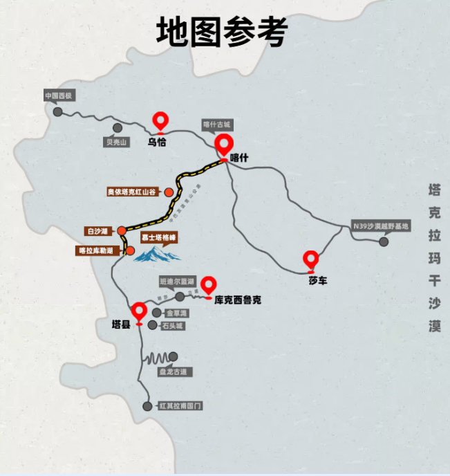 👉前往帕米尔高原地区,途中可车览西域维吾尔族农家田园风光。 🚩前往【奥依塔克红山】这里高山险峻,因山体呈现红色而得名,【远观】奥依塔克红山并拍照,在这里可以购买氧气袋。