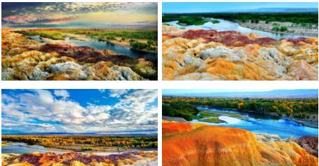 激猛的河流冲击和狂风侵蚀,河岸幻化出多种色彩,形成了独特的悬崖式雅丹地貌,故名“五彩滩”。