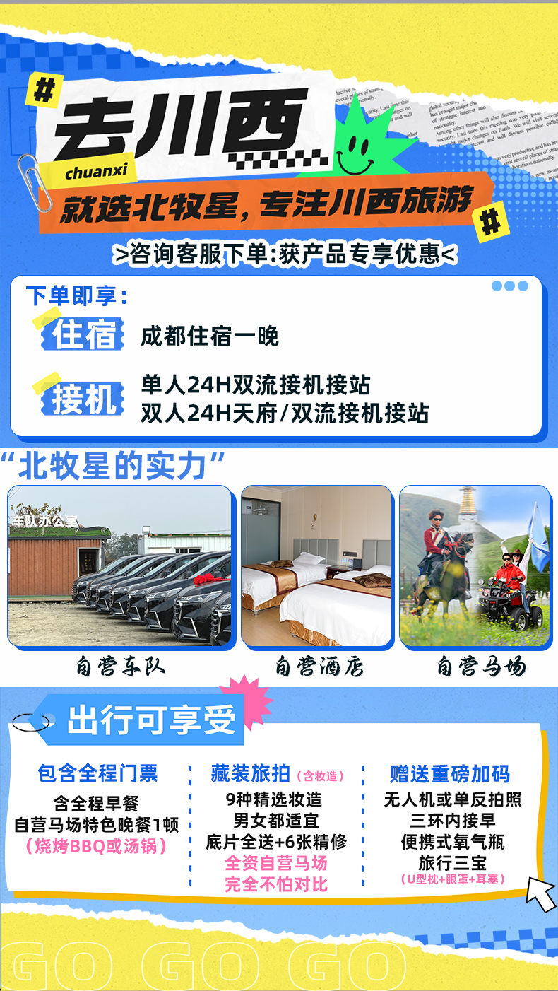 • 自然人文兼顾:打卡雪山、草原、古镇,体验藏区风情,可自主选择骑马等项目。
