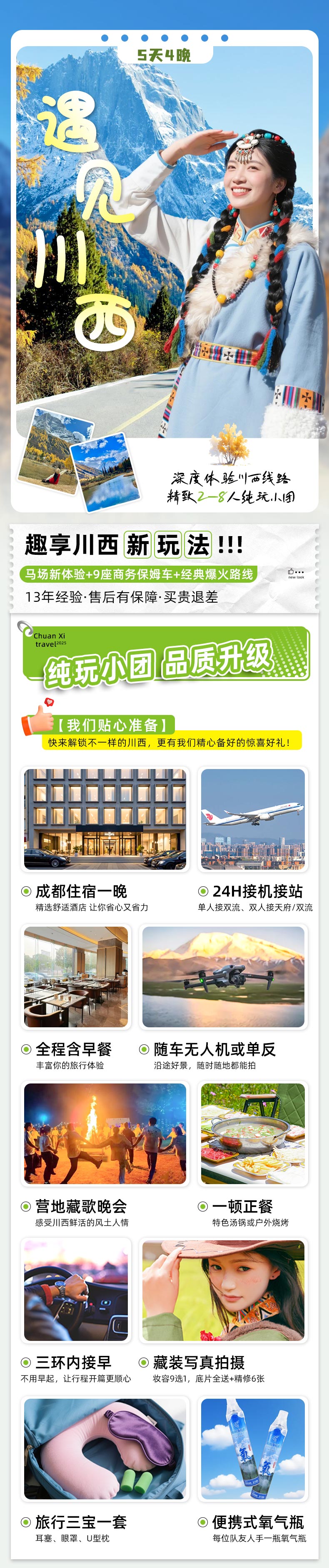 • 交通住宿稳:含成都接送,按人数派车,全程 3 钻酒店,赠旅行三宝和氧气。