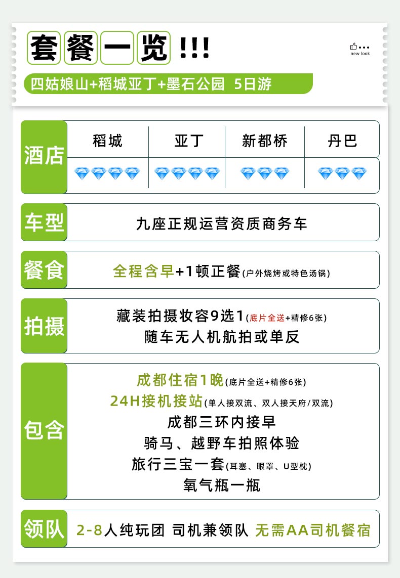 • 景点覆盖全:含稻城亚丁、四姑娘山等核心景区,赠鱼子西、墨石公园等特色体验。