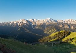 【温馨提示】果子沟大桥是双塔双索面钢桁梁斜拉桥,乘车沿路欣赏果子沟风光!果子沟大桥因交通管制,此点为乘车途观,不可下车游览。