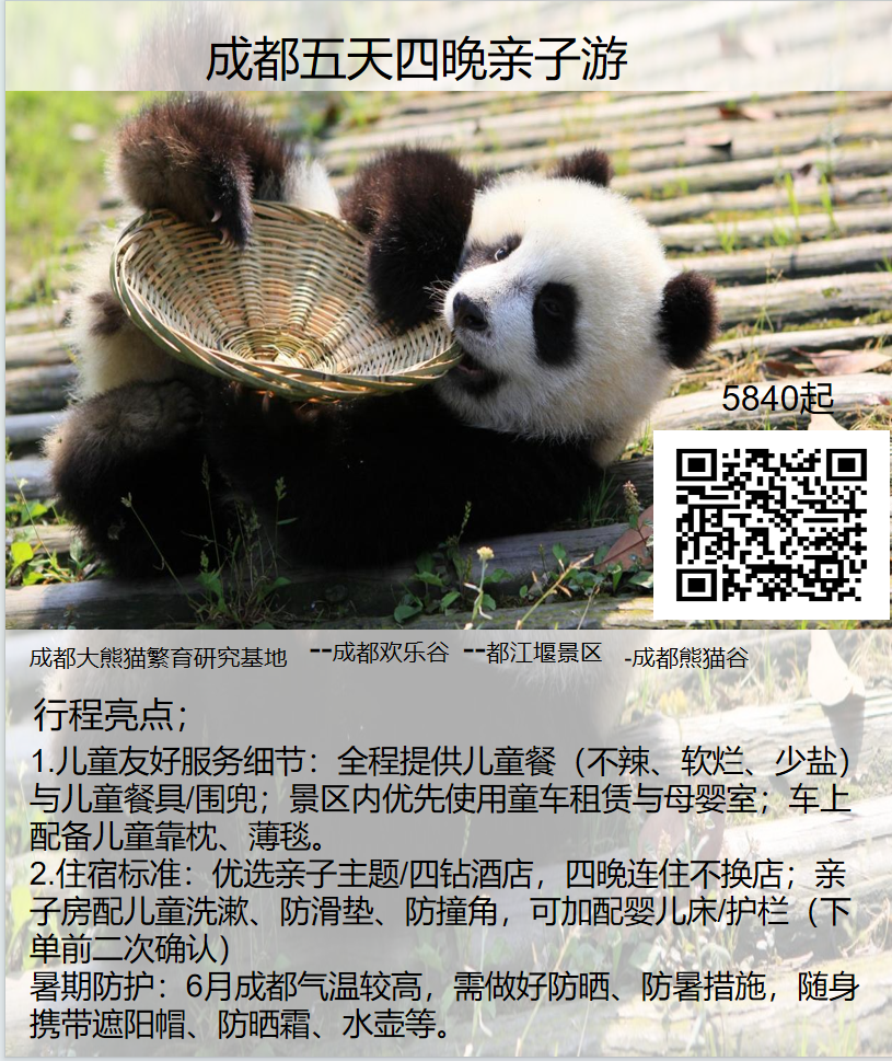 景点说明:大熊猫基地需提前预约,欢乐谷门票含大部分亲子项目,都江堰景区含熊猫谷接驳车。