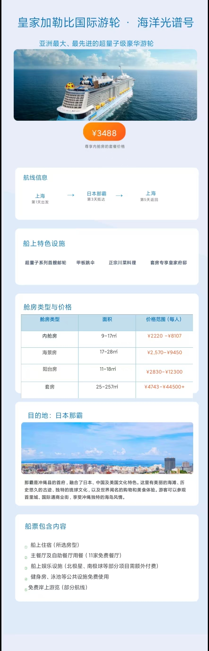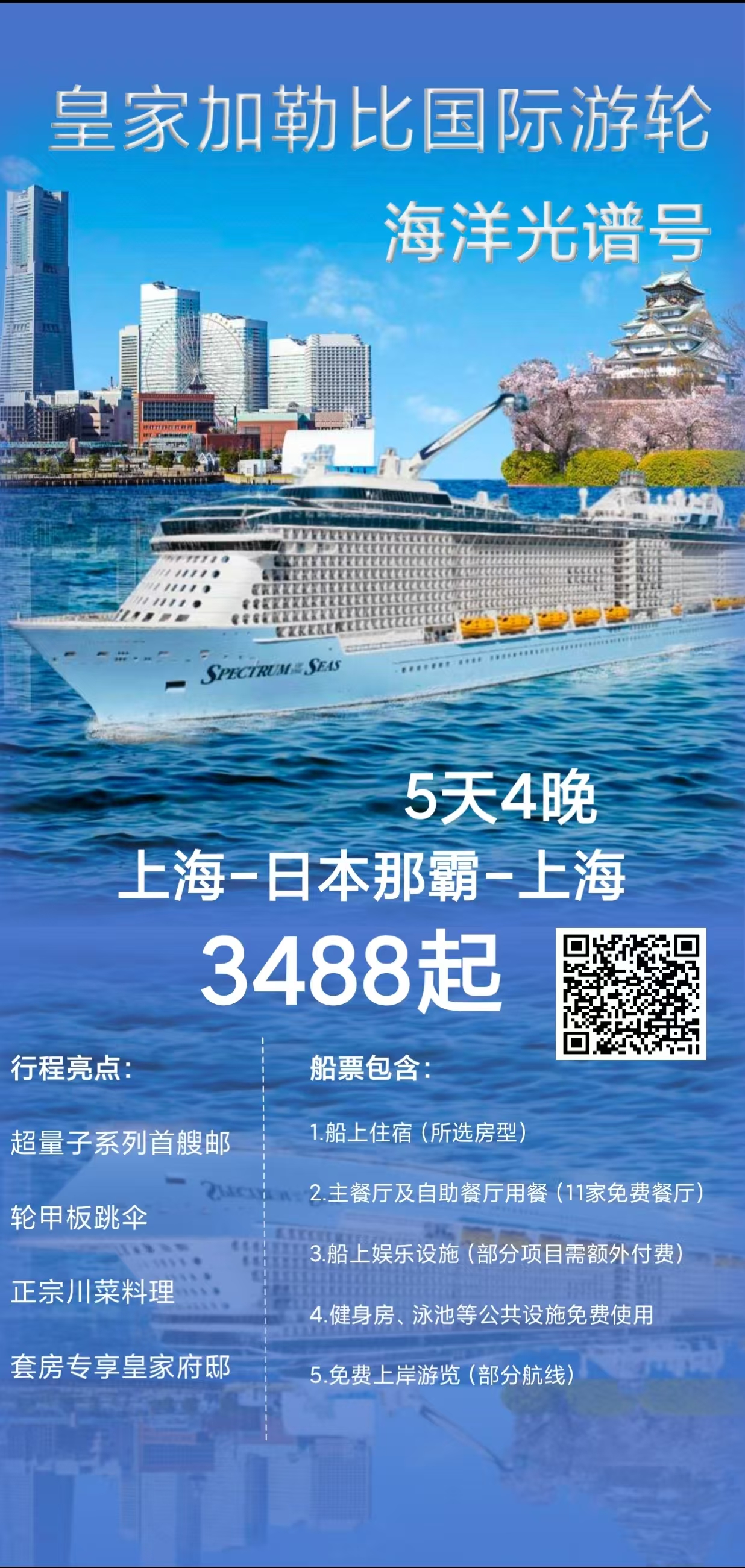 皇家加勒比国际游轮海洋光谱号船票(含4晚住宿、指定餐厅免费膳食、指定的船上设施、船上娱乐节目及活动)。