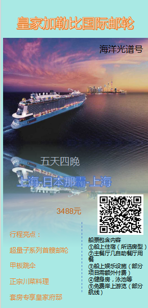 皇家加勒比国际游轮海洋光谱号船票(含4晚住宿、指定餐厅免费膳食、指定的船上设施、船上娱乐节目及活动)。