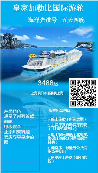 皇家加勒比国际游轮海洋光谱号船票(含4晚住宿、指定餐厅免费膳食、指定的船上设施、船上娱乐节目及活动)。