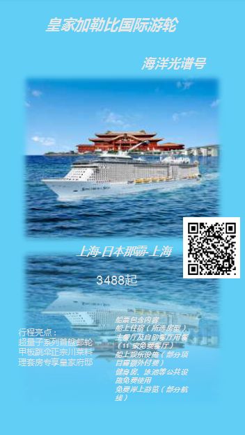 皇家加勒比国际游轮海洋光谱号船票(含4晚住宿、指定餐厅免费膳食、指定的船上设施、船上娱乐节目及活动)。