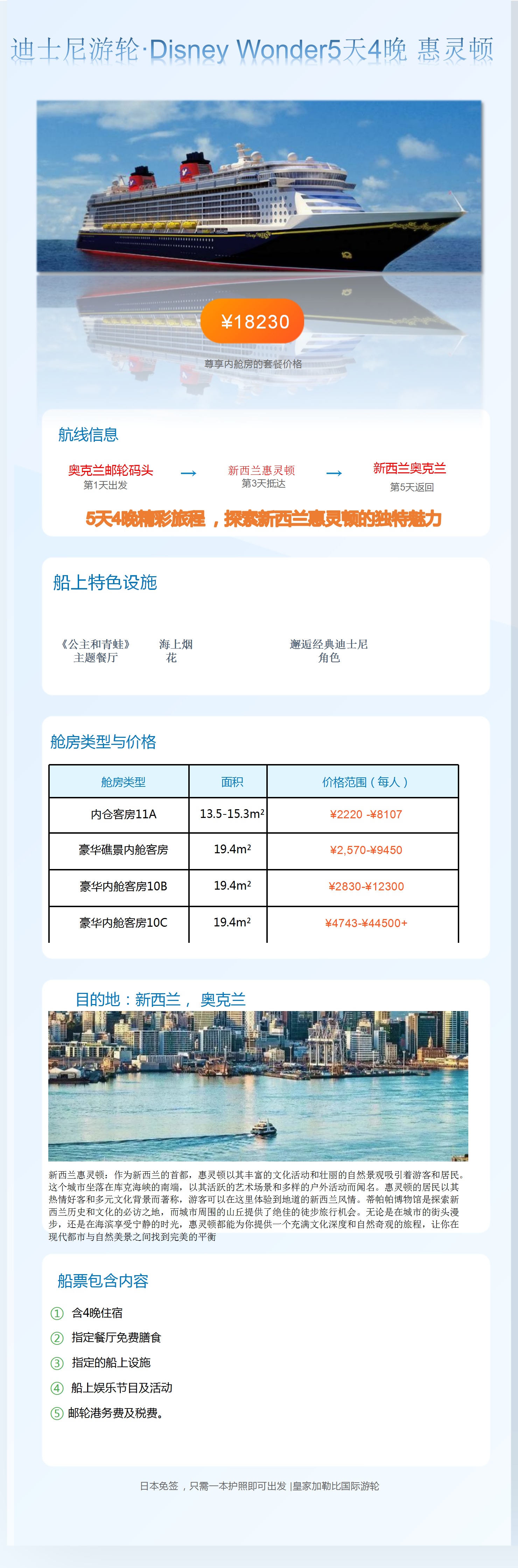 迪士尼游轮Disney Wonder船票(含4晚住宿、指定餐厅免费膳食、指定的船上设施、船上娱乐节目及活动)。
