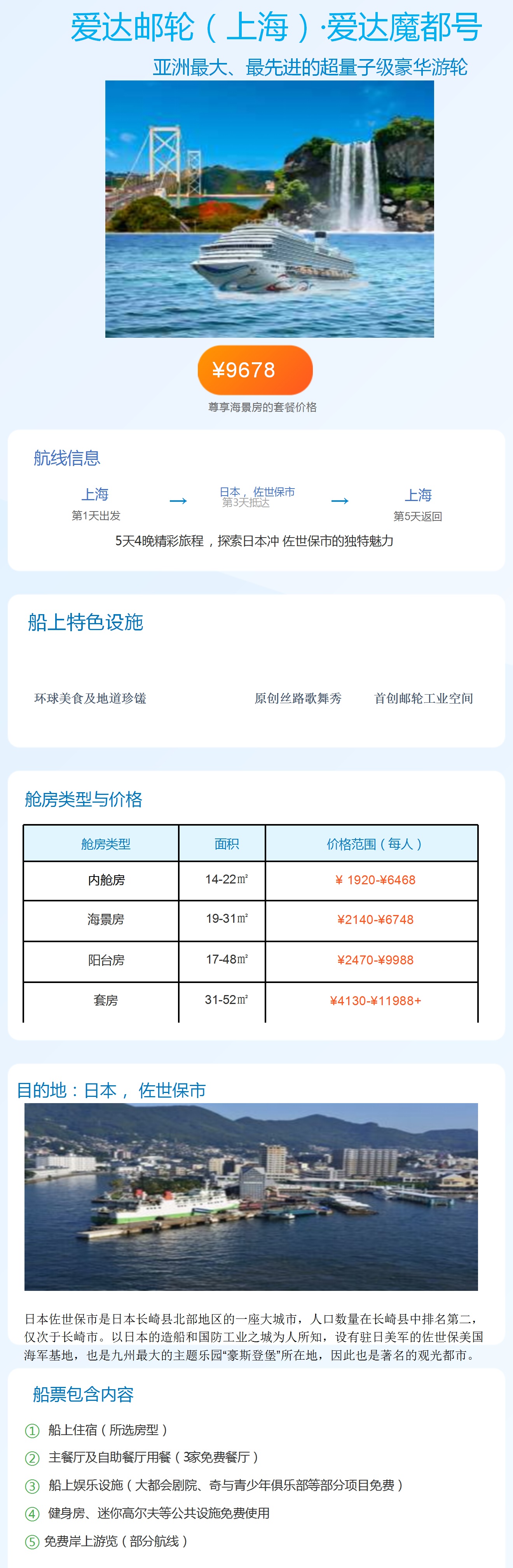 1、爱达邮轮(上海)爱达魔都号船票(含5晚住宿、指定餐厅免费膳食、指定的船上设施、船上娱乐节目及活动)。
