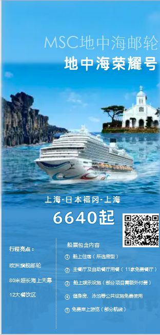 MSC地中海邮轮荣耀号船票(含4晚住宿、指定餐厅免费膳食、指定的船上设施、船上娱乐节目及活动)。
