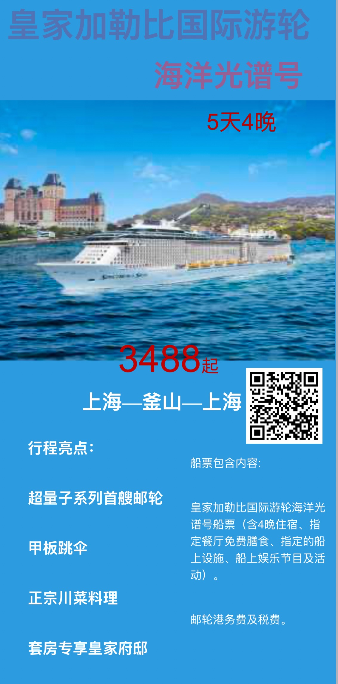 根据邮轮公司规定,乘坐皇家加勒比邮轮出行的客人,需严格遵守邮轮公司的承运条款(承运条款链接地址:https://pages.ctrip.com/tour/pdf3/20131218a.pdf),请您仔细阅读,凡预订本产品则默认已知晓并接受此承运条款。如因违反条款规定所带来的后果,需由您您承担。