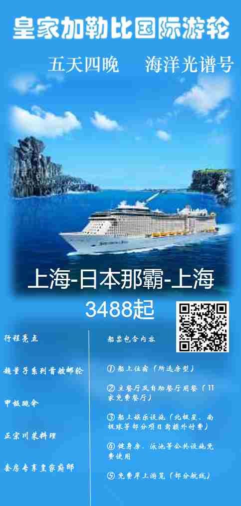 【简介】:今天迎来全天的邮轮海上巡游,让轻松舒适来开启您的邮轮之旅。您可以根据自己的喜好,享受船上的休闲娱乐设施及各式美食,体验丰富多彩的娱乐项目。